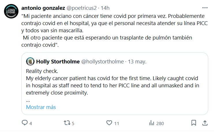 MALA PRAXIS «Mi paciente anciano con cáncer tiene covid por primera vez. Probablemente contrajo covid en el hospital, ya que el personal necesita atender su línea PICC y todos van sin mascarilla. Mi otro paciente que está esperando un trasplante de pulmón también contrajo covid».