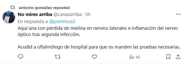 NODIGASCOVID HACE ESTRAGOS Aquí una con pérdida de mielina en nervios laterales e inflamación del nervio óptico tras segunda infección. Acudid a oftalmólogo de hospital para que os manden las pruebas necesarias.