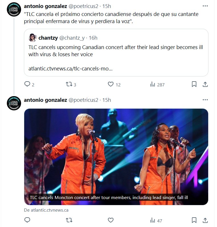 NODIGASCOVID HACE ESTRAGOS «TLC cancela el próximo concierto canadiense después de que su cantante principal enfermara de virus y perdiera la voz» Posted on mayo 15, 2024 por coronado