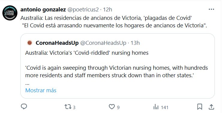 NUNCA SE FUE PERO YA VOLVIÓ Australia: Las residencias de ancianos de Victoria, ‘plagadas de Covid’ «El Covid está arrasando nuevamente los hogares de ancianos de Victoria» Posted on mayo 15, 2024 por coronado https://twitter.com/CoronaHeadsUp/status/1790512200127332368