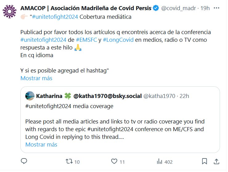 AMACOP | Asociación Madrileña de Covid Persistente @covid_madrid · 19h 👉🏻 «#unitetofight2024 Cobertura mediática Publicad por favor todos los artículos q encontreis acerca de la conferencia #unitetofight2024 de #EMSFC y #LongCovid en medios, radio o TV como respuesta a este hilo 🙏 En cq idioma Y si es posible agregad el hashtag»