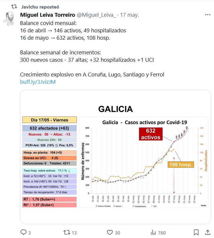 Balance covid mensual: 16 de abril → 146 activos, 49 hospitalizados 16 de mayo → 632 activos, 108 hosp. Balance semanal de incrementos: 300 nuevos casos – 37 altas; +32 hospitalizados +1 UCI Crecimiento explosivo en A Coruña, Lugo, Santiago y Ferrol