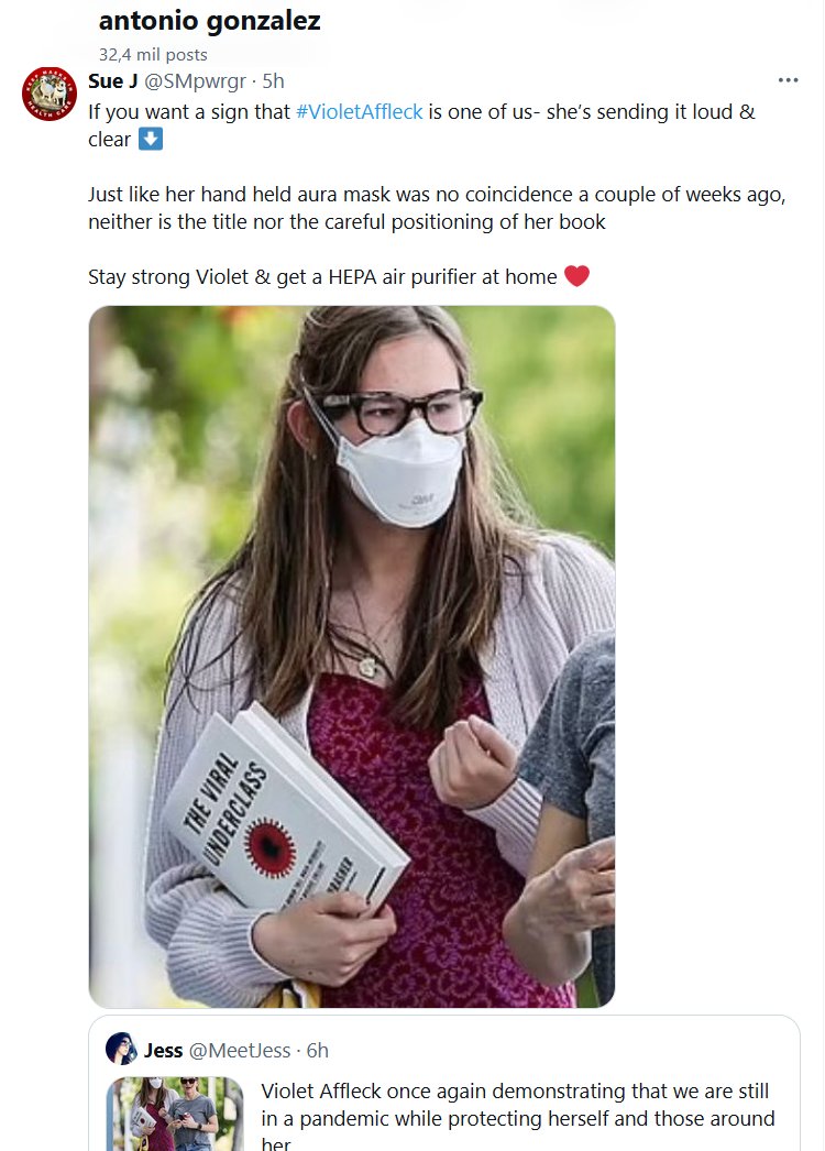 Si quieres una señal de que #VioletAffleck es una de nosotros, ella la envía alto y claro ⬇️ Así como su máscara de aura sostenida en la mano no fue una coincidencia hace un par de semanas, tampoco lo es el título ni la cuidadosa ubicación de su libro. Mantente fuerte Violet y consigue un purificador de aire HEPA en casa ❤️