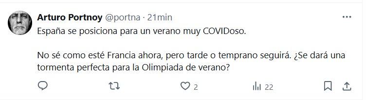 Arturo Portnoy @portna · España se posiciona para un verano muy COVIDoso. No sé como esté Francia ahora, pero tarde o temprano seguirá. ¿Se dará una tormenta perfecta para la Olimpiada de verano?