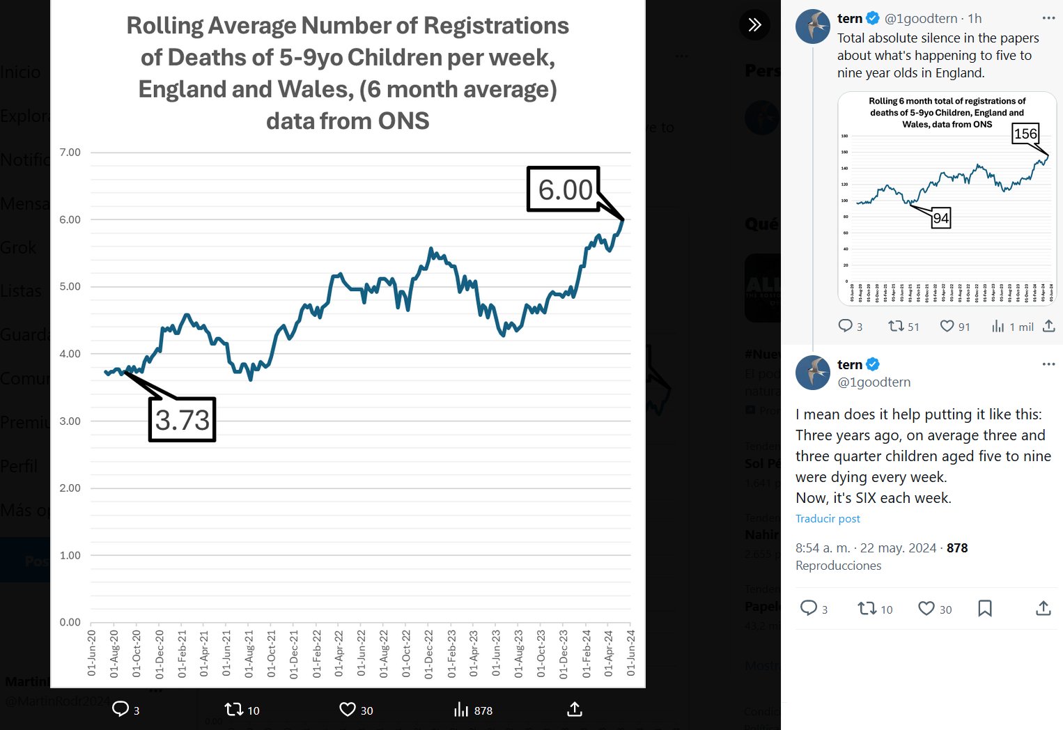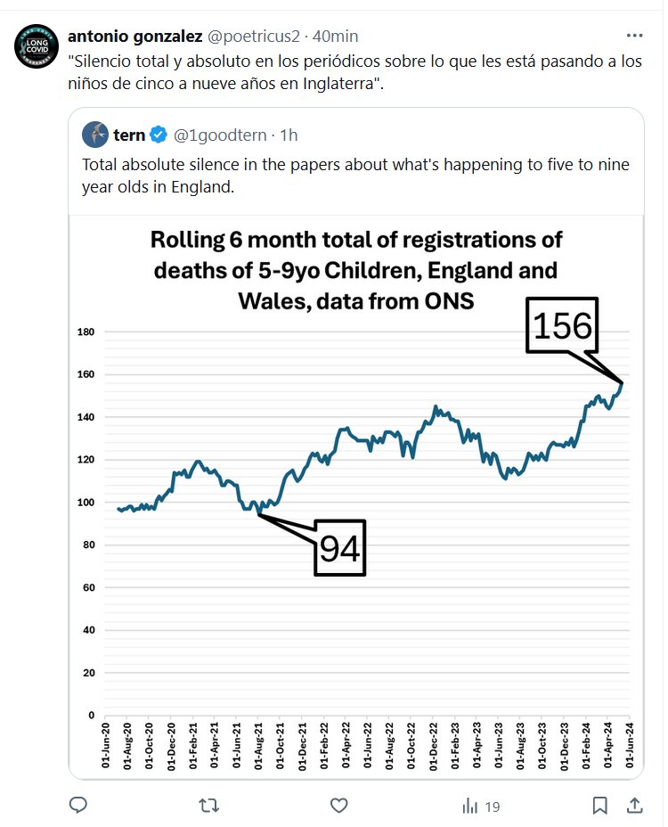LESA HUMANIDAD «Silencio total y absoluto en los periódicos sobre lo que les está pasando a los niños de cinco a nueve años en Inglaterra» «Hace tres años, una media de tres cuartas partes de niños de entre cinco y nueve años morían cada semana. Ahora son SEIS cada semana.»