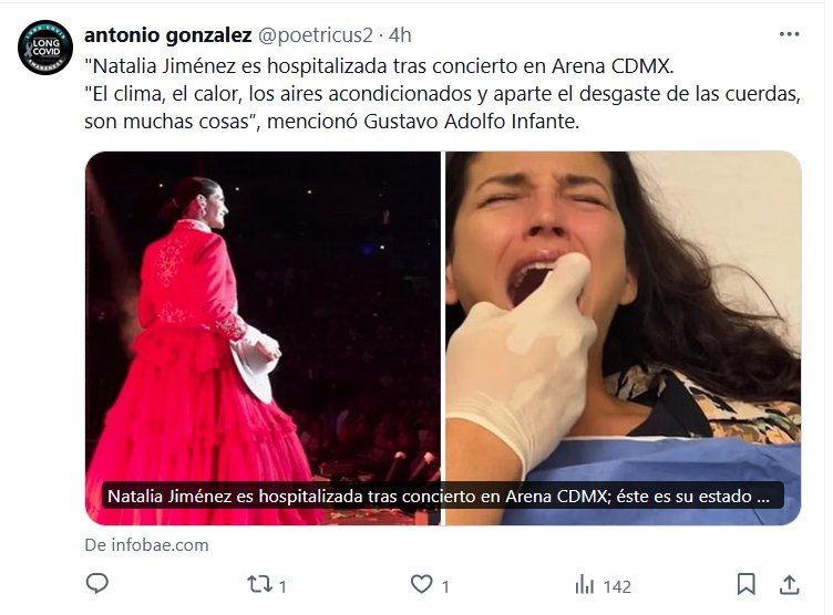 NODIGASCOVID HACE ESTRAGOS «Natalia Jiménez es hospitalizada tras concierto en Arena CDMX. «El clima, el calor, los aires acondicionados y aparte el desgaste de las cuerdas, son muchas cosas”, mencionó Gustavo Adolfo Infante.