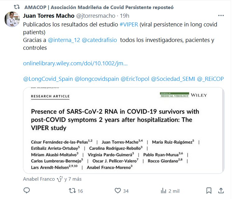 Publicados los resultados del estudio #VIPER (viral persistence in long covid patients) Posted on mayo 22, 2024 por coronado