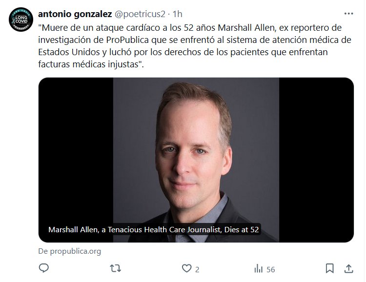 QEPD «Muere de un ataque cardíaco a los 52 años Marshall Allen, ex reportero de investigación de ProPublica que se enfrentó al sistema de atención médica de Estados Unidos y luchó por los derechos de los pacientes que enfrentan facturas médicas injustas»
