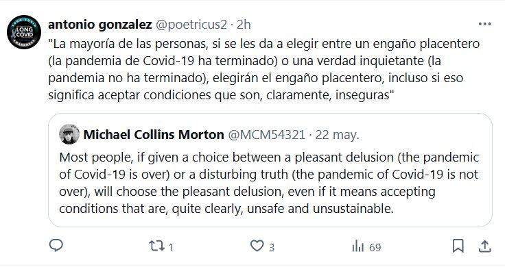 «La mayoría de las personas, si se les da a elegir entre un engaño placentero (la pandemia de Covid-19 ha terminado) o una verdad inquietante (la pandemia no ha terminado), elegirán el engaño placentero, incluso si eso significa aceptar condiciones que son, claramente, inseguras»