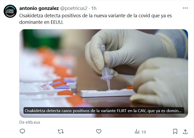 YA LLEGÓ A ESPAÑA Osakidetza detecta positivos de la nueva variante de la covid que ya es dominante en EEUU. Posted on mayo 23, 2024 por coronado https://www.eitb.eus/es/noticias/sociedad/detalle/9502877/osakidetza-detecta-positivos-de-nueva-variante-de-covid-que-ya-es-dominante-en-eeuu/