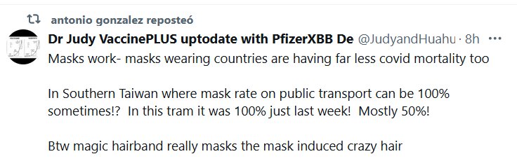 EN INGLÉS Dra Judy VaccinePLUS al día con PfizerXBB Dic23 @JudyandHuahua Las mascarillas funcionan- los países que usan mascarillas están teniendo mucha menos mortalidad por covirus también En el sur de Taiwán, donde la tasa de máscara en el transporte público puede ser 100% a veces? ¡En este tranvía fue del 100% la semana pasada! ¡La mayoría 50%!