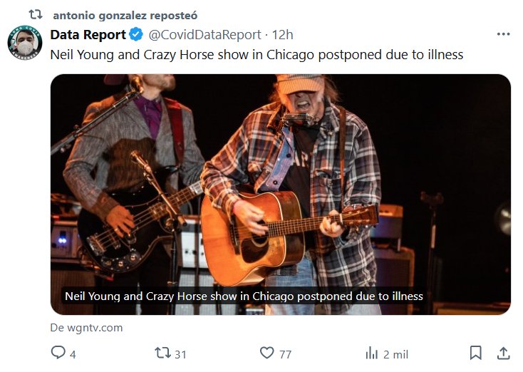EXTRAÑAS ENFERMEDADES EN ERA COVID (EN INGLÉS) El espectáculo de Neil Young y Crazy Horse en Chicago se pospone por enfermedad Posted on mayo 24, 2024 por coronado