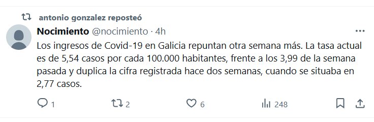 FIN DE PANDEMIA? Los ingresos de Covid-19 en Galicia repuntan otra semana más. La tasa actual es de 5,54 casos por cada 100.000 habitantes, frente a los 3,99 de la semana pasada y duplica la cifra registrada hace dos semanas, cuando se situaba en 2,77 casos