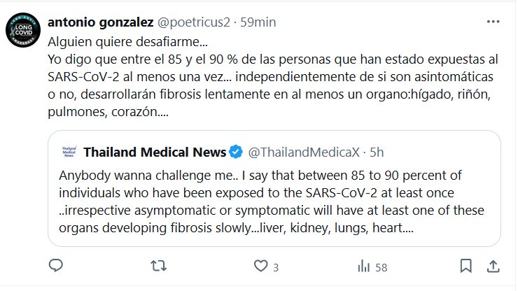 Thailand Medical News @ThailandMedicaX Alguien quiere desafiarme… Yo digo que entre el 85 y el 90 % de las personas que han estado expuestas al SARS-CoV-2 al menos una vez… independientemente de si son asintomáticas o no, desarrollarán fibrosis lentamente en al menos un organo:hígado, riñón, pulmones, corazón….