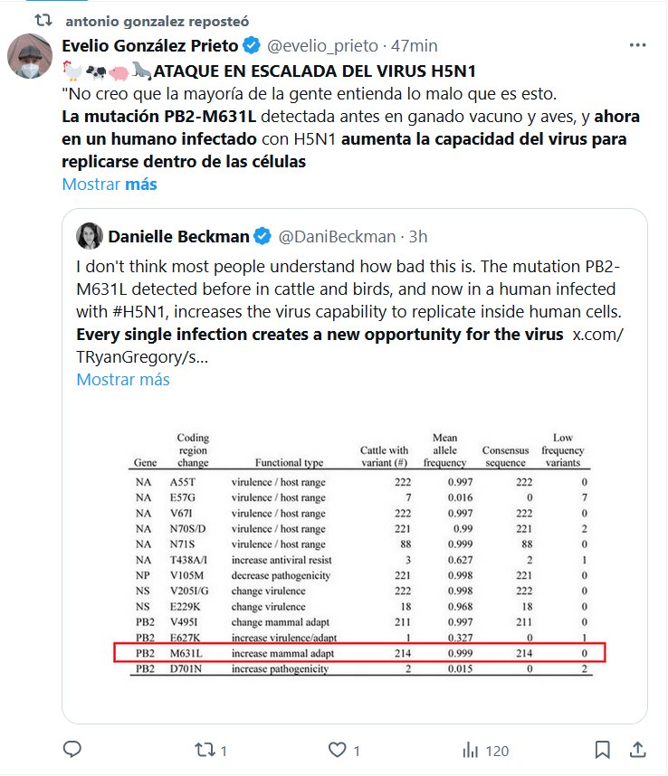 PARAPANDEMIA-SS 🐓🐄🐖🦭ATAQUE EN ESCALADA DEL VIRUS H5N1 «No creo que la mayoría de la gente entienda lo malo que es esto. La mutación PB2-M631L detectada antes en ganado vacuno y aves, y ahora en un humano infectado con H5N1 aumenta la capacidad del virus para replicarse dentro de las células