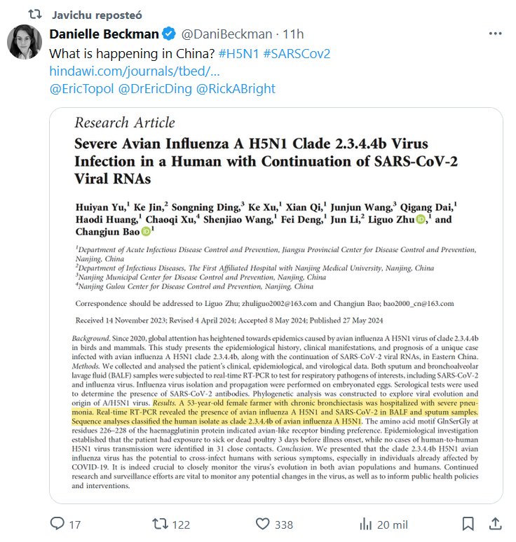 EN INGLÉS ¿Qué está pasando en China? #H5N1 #SARSCov2 Posted on mayo 29, 2024 por coronado https://www.hindawi.com/journals/tbed/2024/8819622/