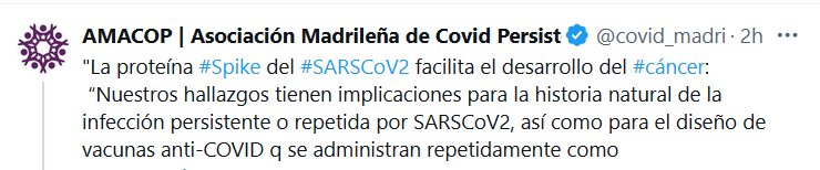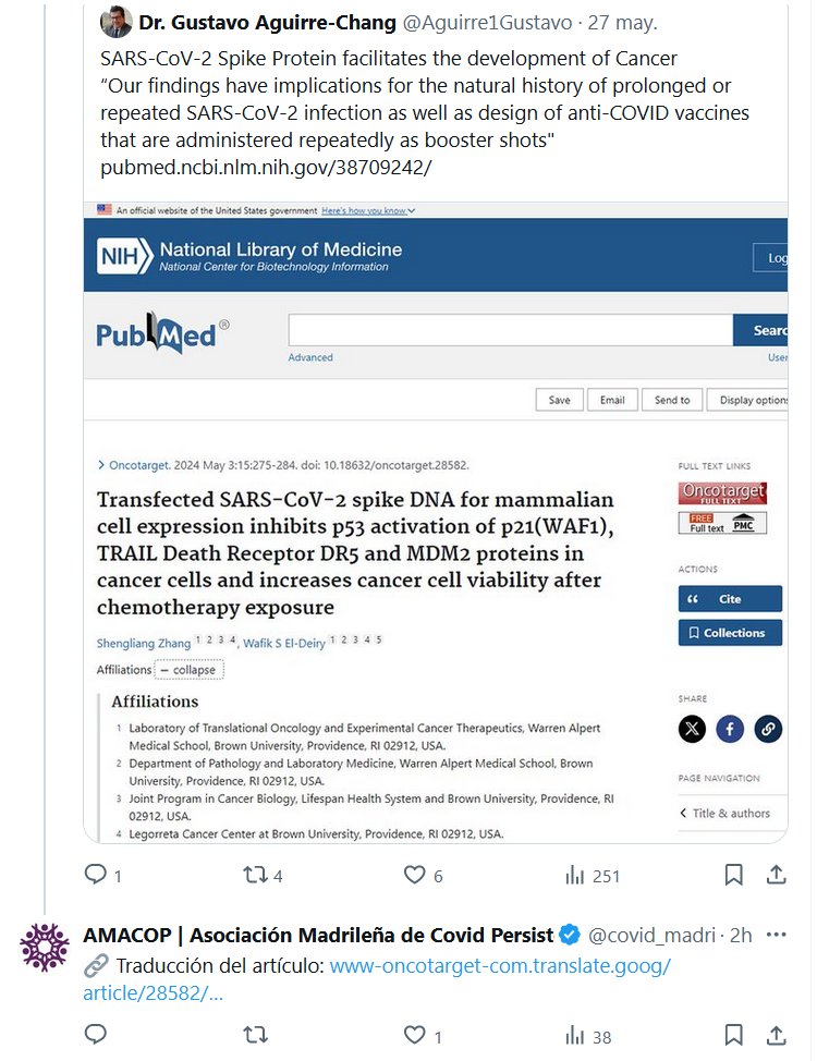 «La proteína #Spike del #SARSCoV2 facilita el desarrollo del #cáncer» Posted on mayo 29, 2024 por coronado https://www-oncotarget-com.translate.goog/article/28582/text/?_x_tr_sl=en&_x_tr_tl=es&_x_tr_hl=es&_x_tr_pto=wapp