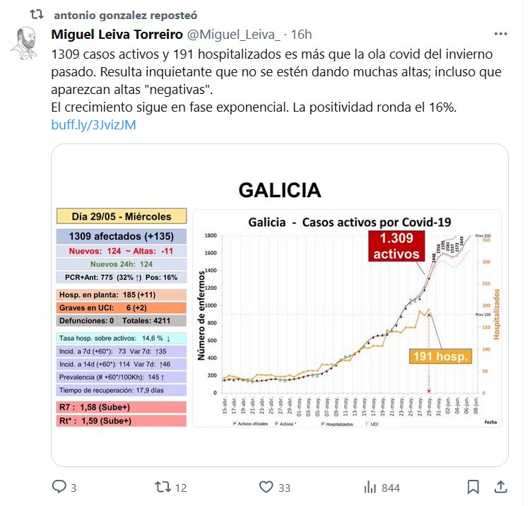 COVID EN GALICIA 1309 casos activos y 191 hospitalizados es más que la ola covid del invierno pasado. Resulta inquietante que no se estén dando muchas altas; incluso que aparezcan altas «negativas». El crecimiento sigue en fase exponencial. La positividad ronda el 16%.