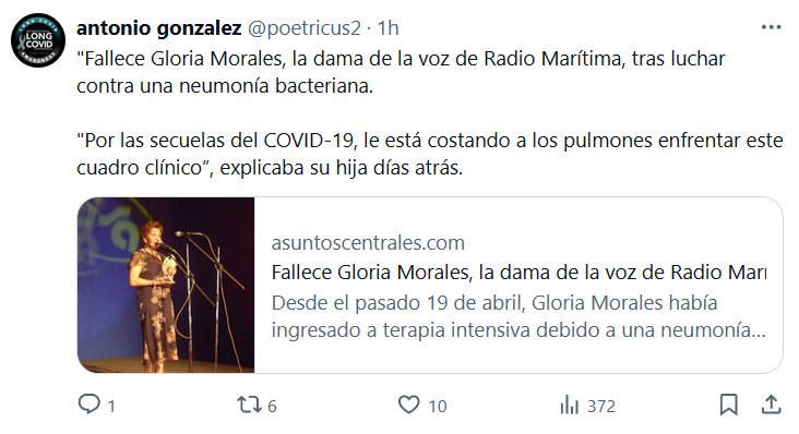 «Fallece Gloria Morales, la dama de la voz de Radio Marítima, tras luchar contra una neumonía bacteriana. «Por las secuelas del COVID-19, le está costando a los pulmones enfrentar este cuadro clínico”, explicaba su hija días atrás.