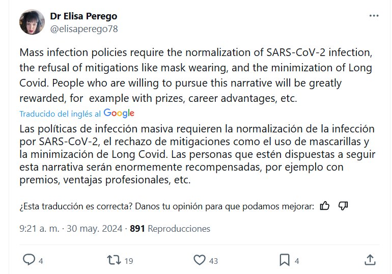 LEY DE OMERTÁ COVID (EN INGLÉS) Dr Elisa Perego @elisaperego78 Las políticas de infección masiva requieren la normalización de la infección por SARS-CoV-2, el rechazo de mitigaciones como el uso de mascarillas y la minimización de Long Covid. Las personas que estén dispuestas a seguir esta narrativa serán enormemente recompensadas, por ejemplo con premios, ventajas profesionales, etc.