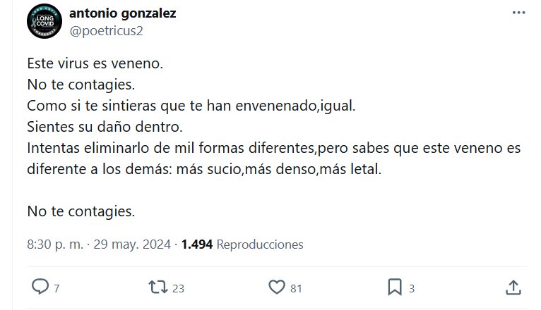 TESTIMONIOS Antonio González @poetricus2 Este virus es veneno. No te contagies. Como si te sintieras que te han envenenado,igual. Sientes su daño dentro. Intentas eliminarlo de mil formas diferentes,pero sabes que este veneno es diferente a los demás: más sucio,más denso,más letal. No te contagies.
