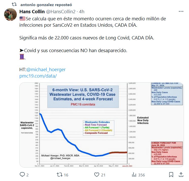 🇺🇲Se calcula que en éste momento ocurren cerca de medio millón de infecciones por SarsCoV2 en Estados Unidos, CADA DÍA. Significa más de 22.000 casos nuevos de Long Covid, CADA DÍA. ➤Covid y sus consecuencias NO han desaparecido.