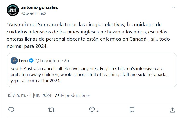 NODIGASCOVID HACE ESTRAGOS Australia del Sur cancela todas las cirugías electivas, las unidades de cuidados intensivos de los niños ingleses rechazan a los niños, escuelas enteras llenas de personal docente están enfermos en Canadá… sí… todo normal para 2024