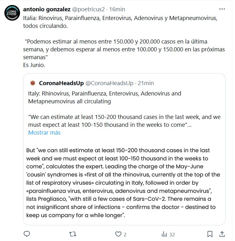 POSTCOVID HACE ESTRAGOS Italia: Rinovirus, Parainfluenza, Enterovirus, Adenovirus y Metapneumovirus, todos circulando. «Podemos estimar al menos entre 150.000 y 200.000 casos en la última semana, y debemos esperar al menos entre 100.000 y 150.000 en las próximas semanas» Es Junio.