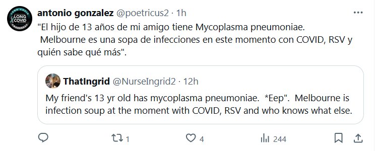 TESTIMONIOS «El hijo de 13 años de mi amigo tiene Mycoplasma pneumoniae. Melbourne es una sopa de infecciones en este momento con COVID, RSV y quién sabe qué más» Posted on junio 1, 2024 por coronado
