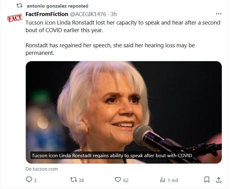 EN INGLÉS El ícono de Tucson, Linda Ronstadt, perdió su capacidad de hablar y oír después de un segundo ataque de COVID a principios de este año. Ronstadt ha recuperado el habla, dijo que su pérdida auditiva puede ser permanente