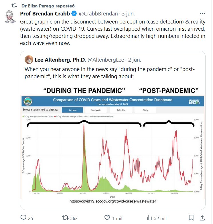 LA ÚNICA VERDAD SIGUE SIENDO LA REALIDAD (EN INGLÉS) Dra. Elisa Perego reposteó Profesor Brendan Crabb @CrabbBrendan · 3 de junio. Excelente gráfico sobre la desconexión entre la percepción (detección de casos) y la realidad (aguas residuales) sobre COVID-19. Las curvas se superpusieron por última vez cuando llegó omicron por primera vez, luego las pruebas/informes desaparecieron. Incluso ahora hay cifras extraordinariamente altas de infectados en cada ola.