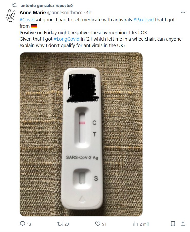TESTIMONIOS (EN INGLÉS) El #Covid #4 se ha ido. Tuve que automedicarme con antivirales #Paxlovid que conseguí en 🇩🇪 Positivo el viernes por la noche negativo el martes por la mañana. Me siento bien. Teniendo en cuenta que tuve #LongCovid en ’21 que me dejó en una silla de ruedas, ¿alguien puede explicar por qué no califico para antivirales en el Reino Unido?