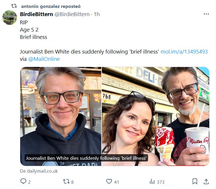 EXTRAÑAS MUERTES EN ERA COVID (EN INGLÉS) RIP [ Requiescat in pace (descanse en paz en latín) ] Edad 52 Breve enfermedad El periodista Ben White muere repentinamente tras una «breve enfermedad»