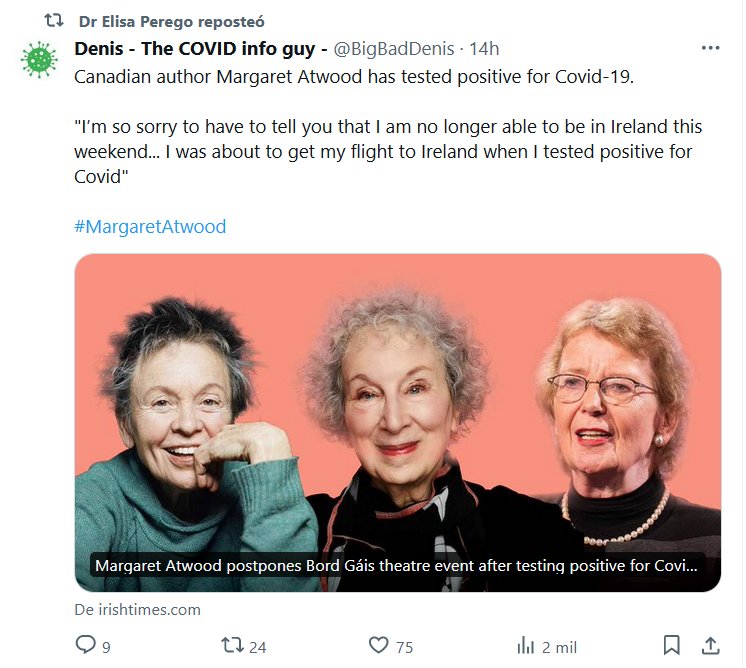 EN INGLÉS Dra. Elisa Perego reposteó Denis – El chico de la información de COVID – @BigBadDenis La autora canadiense Margaret Atwood dio positivo por Covid-19. «Lamento mucho tener que decirles que ya no puedo estar en Irlanda este fin de semana… Estaba a punto de tomar mi vuelo a Irlanda cuando di positivo por Covid»