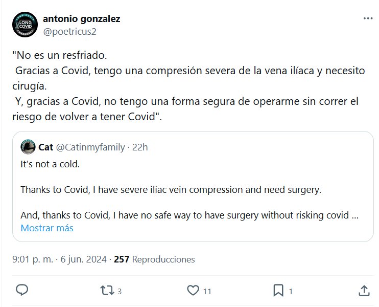 TESTIMONIOS «No es un resfriado. Gracias a Covid, tengo una compresión severa de la vena ilíaca y necesito cirugía. Y, gracias a Covid, no tengo una forma segura de operarme sin correr el riesgo de volver a tener Covid»
