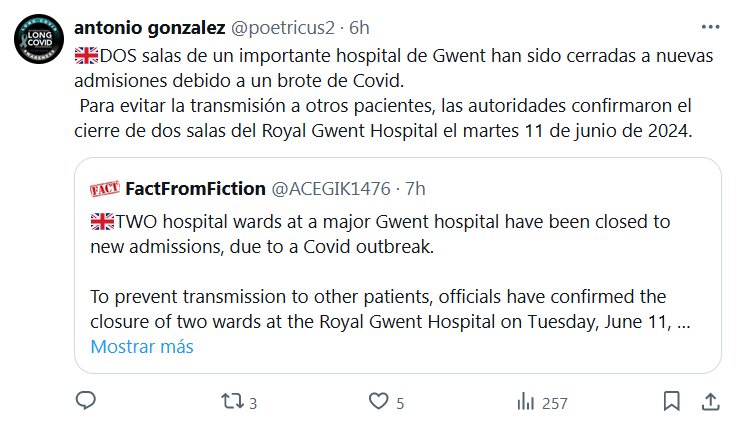 LA OMS DECRETARÁ EL SIN «FIN DE PANDEMIA»? 🇬🇧DOS salas de un importante hospital de Gwent han sido cerradas a nuevas admisiones debido a un brote de Covid. Para evitar la transmisión a otros pacientes, las autoridades confirmaron el cierre de dos salas del Royal Gwent Hospital el martes 11 de junio de 2024