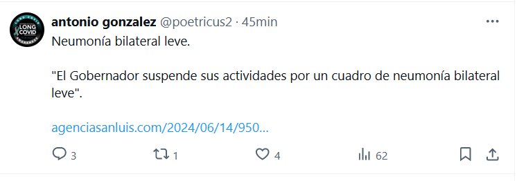 NODIGAMOSCOVID SIGUE HACIENDO ESTRAGOS A SOTTOVOCE: SAN LUIS, ARGENTINA Neumonía bilateral leve. «El Gobernador suspende sus actividades por un cuadro de neumonía bilateral leve» Posted on junio 14, 2024 por coronado https://agenciasanluis.com/2024/06/14/950197-el-gobernador-suspende-sus-actividades-por-un-cuadro-neumonia-bilateral-leve/