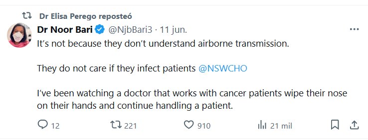 TESTIMONIANDO (EN INGLÉS) No es porque no comprendan la transmisión aérea. No les importa si infectan a los pacientes @NSWCHO He estado observando a un médico que trabaja con pacientes con cáncer limpiarse la nariz con las manos y seguir atendiendo a un paciente.