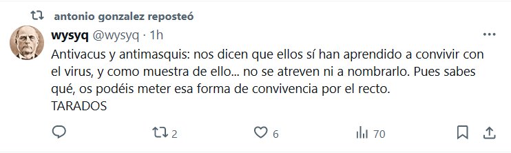 ENOJO SOCIAL «Antivacus y antimasquis: nos dicen que ellos sí han aprendido a convivir con el virus, y como muestra de ello… no se atreven ni a nombrarlo. Pues sabes qué, os podéis meter esa forma de convivencia por el recto. TARADOS»