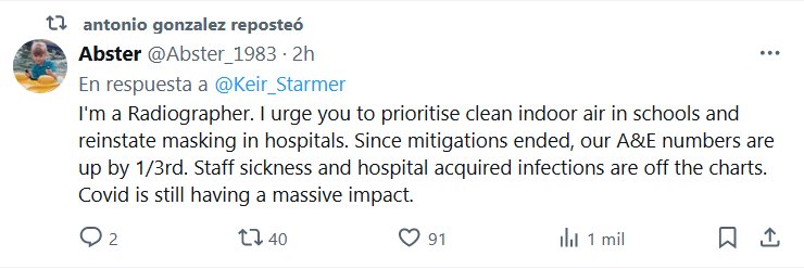 TESTIMONOS (EN INGLÉS) Soy radiólogo. Les insto a que den prioridad al aire interior limpio en las escuelas y restablezcan el uso de mascarillas en los hospitales. Desde que finalizaron las mitigaciones, nuestras cifras de A&E han aumentado en 1/3. Las enfermedades del personal y las infecciones hospitalarias están fuera de serie. Covid sigue teniendo un impacto enorme.