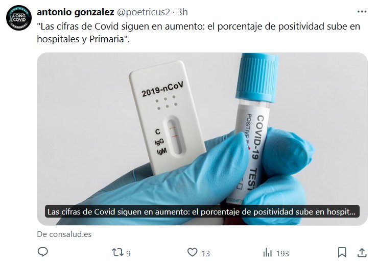 FIN DE PANDEMIA… EN LA LUNA! «Las cifras de Covid siguen en aumento: el porcentaje de positividad sube en hospitales y Primaria» Posted on junio 17, 2024 por coronado https://www.consalud.es/pacientes/cifras-covid-siguen-en-aumento-porcentaje-positividad-sube-en-hospitales-primaria_145241_102.html