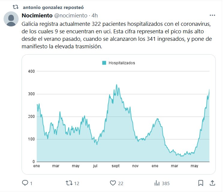 Galicia registra actualmente 322 pacientes hospitalizados con el coronavirus, de los cuales 9 se encuentran en uci. Esta cifra representa el pico más alto desde el verano pasado, cuando se alcanzaron los 341 ingresados, y pone de manifiesto la elevada trasmisión