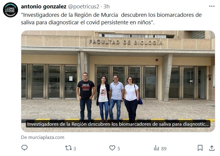 «Investigadores de la Región de Murcia descubren los biomarcadores de saliva para diagnosticar el covid persistente en niños» Posted on junio 17, 2024 por coronado MURCIA ES HUERTA PERO TAMBIÉN MURCIA ES CIENCIA ¡LA TIERRA DE LOS BELENES ES SALUD POR DONDE LA VEAS!