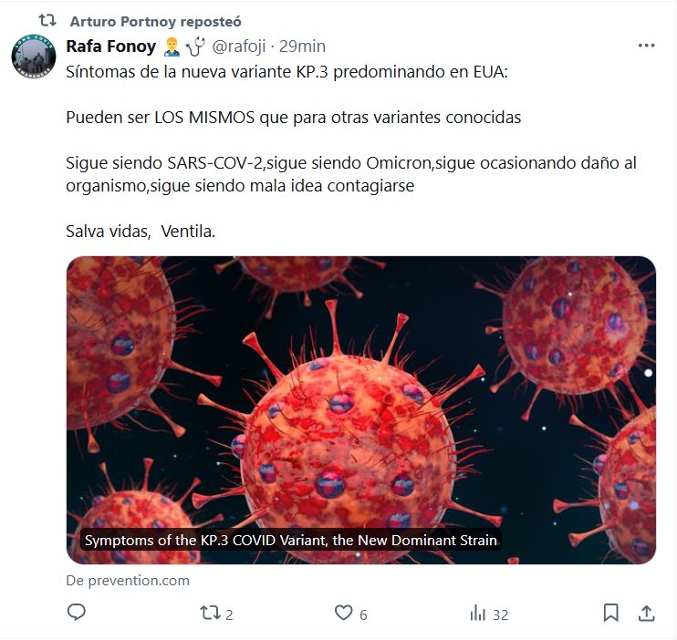 BUENA DATA Y BUENOS CONSEJOS Síntomas de la nueva variante KP.3 predominando en EUA: Pueden ser LOS MISMOS que para otras variantes conocidas Sigue siendo SARS-COV-2,sigue siendo Omicron,sigue ocasionando daño al organismo,sigue siendo mala idea contagiarse Salva vidas, Ventila.