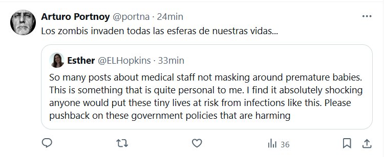 EN INGLÉS Tantas publicaciones sobre el personal médico que no usa mascarillas cuando está cerca de bebés prematuros. Esto es algo que es bastante personal para mí. Me parece absolutamente impactante que alguien ponga en riesgo estas pequeñas vidas a causa de infecciones como ésta. Por favor, rechacen estas políticas gubernamentales que están dañando
