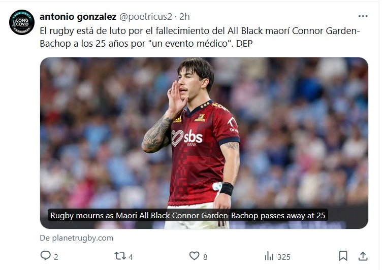 EXTRAÑAS MUERTES EN LA ERA COVID El rugby está de luto por el fallecimiento del All Black maorí Connor Garden-Bachop a los 25 años por «un evento médico». DEP Posted on junio 18, 2024 por coronado CUENDO SE MORÍAN DE SIDA DECÍAN LA CAUSA ¡AHORA NO! REPETIDAMENTE Y MISTERIOSAMENTE NO DICEN DE QUE MUEREN