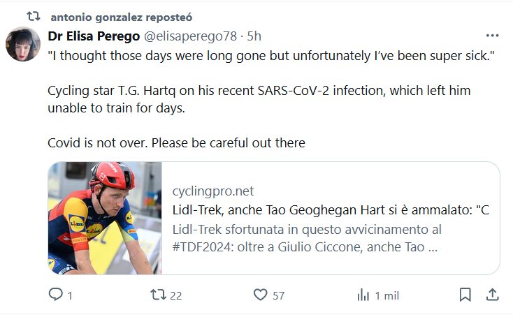 HAZLE CASO A LA DOCTORA (EN INGLÉS) Dra. Elisa Perego @elisaperego78 «Pensé que esos días ya habían pasado, pero desafortunadamente he estado muy enfermo». La estrella del ciclismo T.G. Hartq sobre su reciente infección por SARS-CoV-2, que lo dejó sin poder entrenar durante días. El Covid no ha terminado. Tenga cuidado ahí fuera
