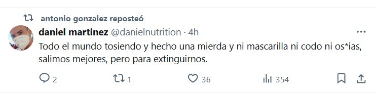LA INDIGNACIÓN DE LA GENTE Todo el mundo tosiendo y hecho una mierda y ni mascarilla ni codo ni os*ias, salimos mejores, pero para extinguirnos. Posted on junio 18, 2024 por coronado