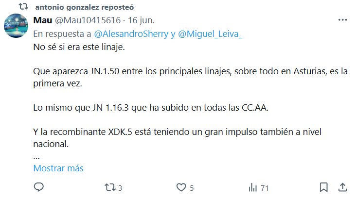 No sé si era este linaje. Que aparezca JN.1.50 entre los principales linajes, sobre todo en Asturias, es la primera vez. Lo mismo que JN 1.16.3 que ha subido en todas las CC.AA. Y la recombinante XDK.5 está teniendo un gran impulso también a nivel nacional. No me gusta, no.🤔