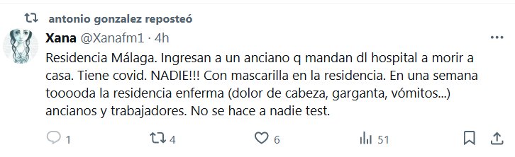NOS MANDAN A MORIR! TESTIMONIOS Residencia Málaga. Ingresan a un anciano q mandan dl hospital a morir a casa. Tiene covid. NADIE!!! con mascarilla en la residencia. En una semana tooooda la residencia enferma (dolor de cabeza, garganta, vómitos…) ancianos y trabajadores. No se hace a nadie test.